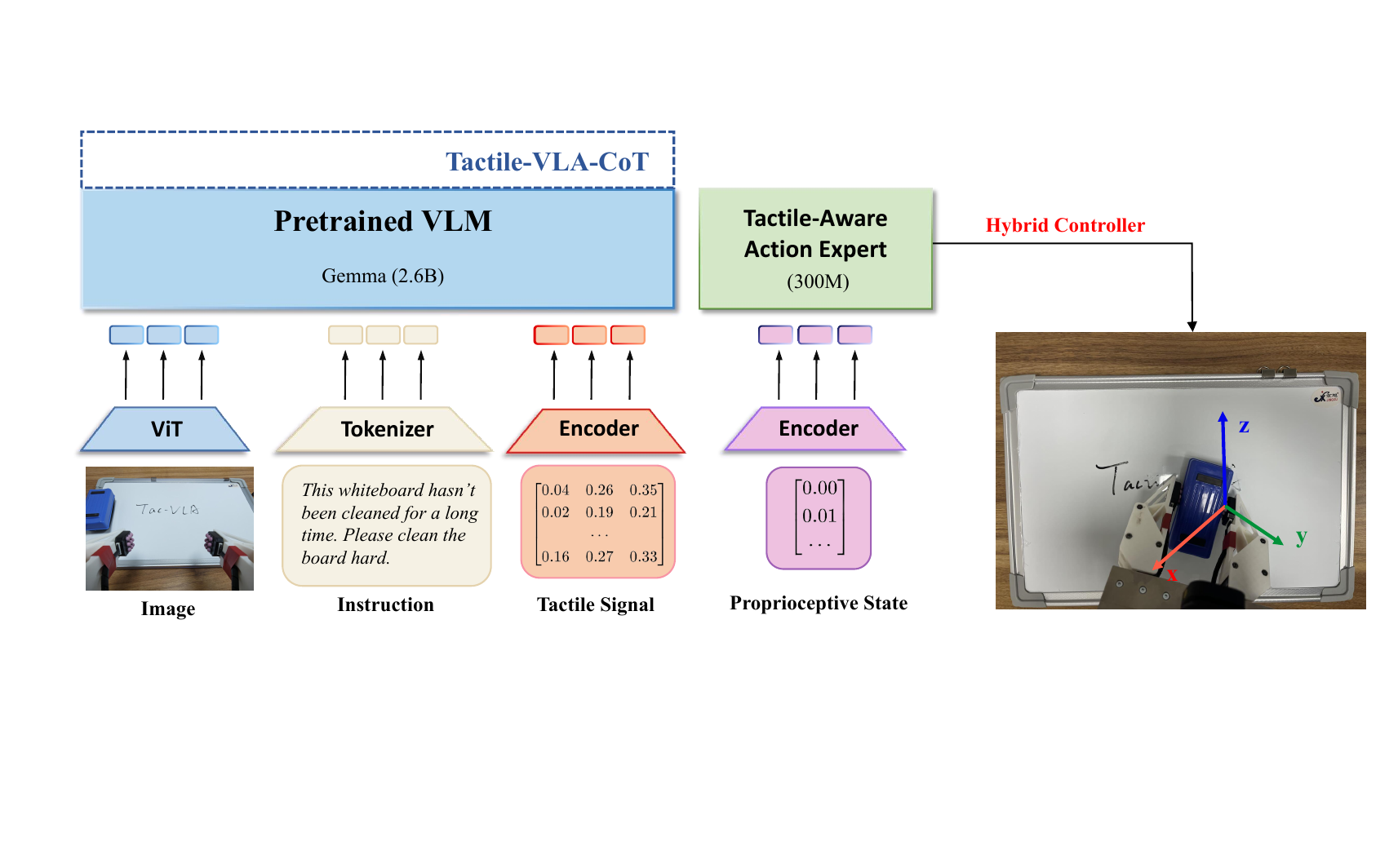 Figure 1: Tactile-VLA architecture. Vision, language, tactile, and proprioceptive inputs are encoded and fused via a pre-trained VLM. The tactile-aware action expert generates target position and force for hybrid position-force control.