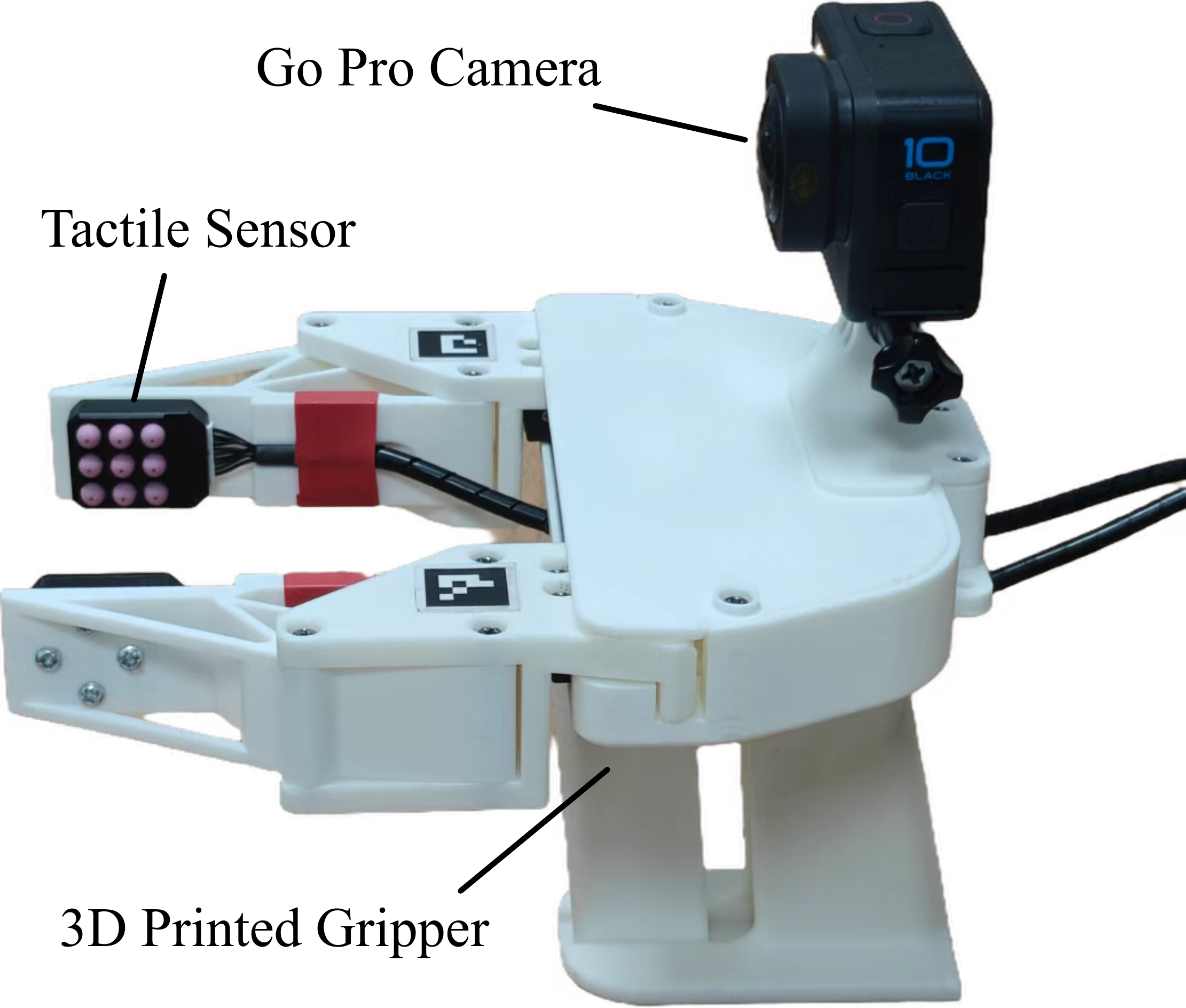 Figure 2: Data collection setup. We augmented the UMI gripper with dual high-resolution tactile sensors and GoPro camera for capturing synchronized multimodal demonstrations.