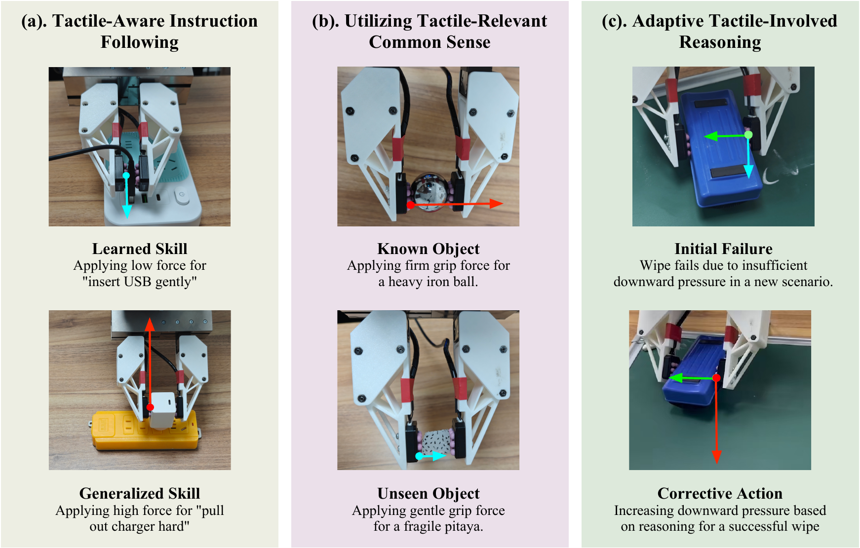 Figure 3: Key capabilities of Tactile-VLA. (a) Tactile-aware instruction following: generalizes force-related language to new tasks (b) Utilizing tactile-relevant common sense: applies appropriate grasps for different objects (c) Adaptive tactile-involved reasoning: recovers from failures through reasoning.